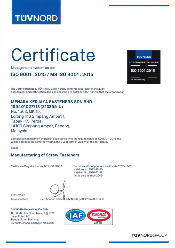 Menara Kerjaya Fasteners Sdn. Bhd. (MK) started production in 1995 with the aim to fill the gap of shortage of supply and increasing demand for quality fasteners in the industry. MK which is located in Perda SMI Industrial Park, Penang, is a 100% Malaysian-owned Fasteners Company and was well established for over 2 decades.
